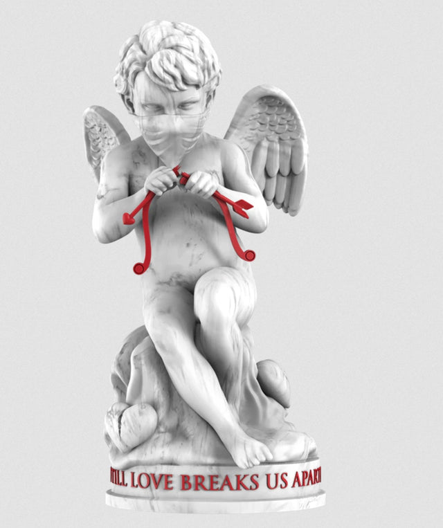 No More Amore Polystone Sculpture Limited Edition Artwork by Artist Abell Octovan of Pop Graffiti Painting & Street Art Fame. 2022 Valentine's Day Special Cupid’s done with matching lovers. He’s tired of the commercialization of Valentine’s Day, tired of the painful wailing of broken hearts, tired of listening to people begging to go back to their exes. Romance is dead, things are the new love. Surrounded by broken hearts, he rests and snaps his red bow and arrow. Drawing inspiration from classic Greek sculptures, No More Amore features a smooth marble-like effect. Emphasized in red are his bow and arrow, and the phrase “Till love breaks us apart”, representing the eventual heartbreak love brings.