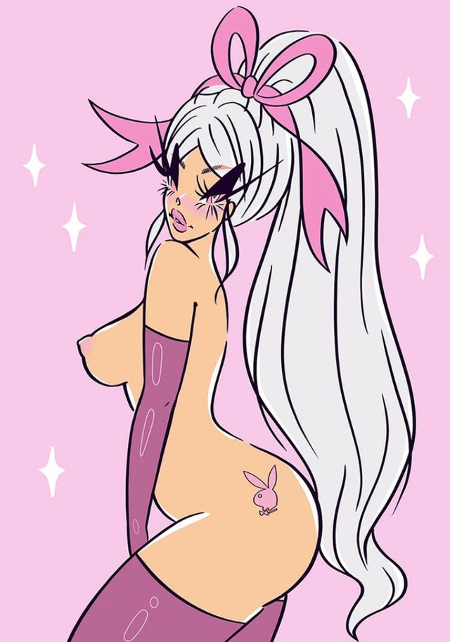 The artwork features a stylized, exaggerated female figure with flowing blonde hair, oversized lashes, and an attitude that exudes both innocence and power. Dressed in a pink and white bunny-inspired bikini, complete with fur pom-pom ties and a bow, the character embodies a mix of nostalgia, seduction, and pop-infused rebellion. The soft pastel color palette, contrasted with thick black outlines, enhances the visual impact, making it a signature piece within the artist’s growing body of collectible prints.