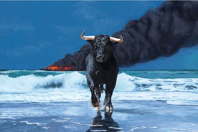 Landfall Artwork Giclee Limited Edition Print on 290GSM Fine Art Paper by Pop Culture Graffiti Artist Josh Keyes. Edition of 175 18x26 inches / 46x66cm Fine art print on 290gsm paper Hand signed and numbered The hybrid world that Keyes has created steps on surrealism and photorealism, a mix that unsettles the viewers, making us feel unsafe and exposed to an uncertain and mischievous future. At the core of work exists the concern for our survival and the earth's future. This preoccupation is highlighted through the display of animals lost and displaced from their natural settings. They are in peril and away from their natural ecosystem, relocated in dioramic fantastical situations.