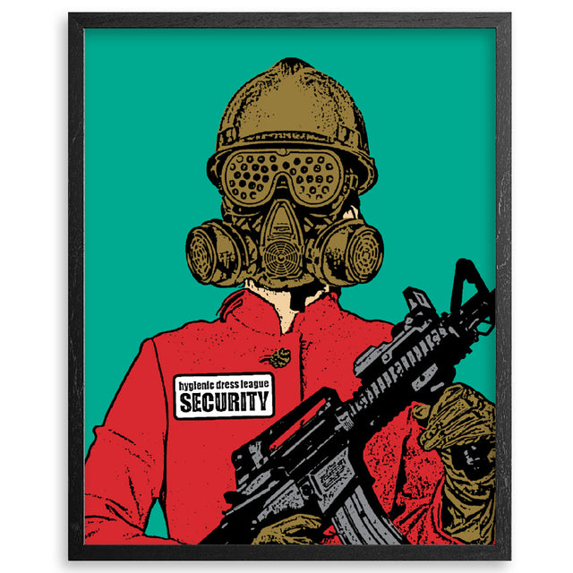 Female Security Limited Edition 6-Color Hand-Pulled Silkscreen Print on 290gsm Coventry Rag Fine Art Paper by Hygienic Dress League Graffiti Street Artist Modern Pop Art. Dorota (b. 1978, Poland) and Steve Coy (b. 1978, USA) are husband and wife conceptual and visual artist duo based in Detroit. Their current project, Hygienic Dress League (HDL, HDL, Corp.), is a conceptual art project that uses a legally registered corporation as a new and original form of art. Their large-scale public interventions and immersive environments use a variety of mediums including the “found object” and often leverage technology in ways that produce unique experiences. Their work is often epistemological in nature and explores aspects of the human condition and contemporary society while challenging reality, truth, and belief systems. Projects are often speculative in nature and are influenced by various aspects of other art movements, notably conceptual art, relational aesthetics, surrealism, and street art. The symbolic imagery creates a paradox of image and concept resulting in an aesthetic that has been described as “Dystopian Glamour.”