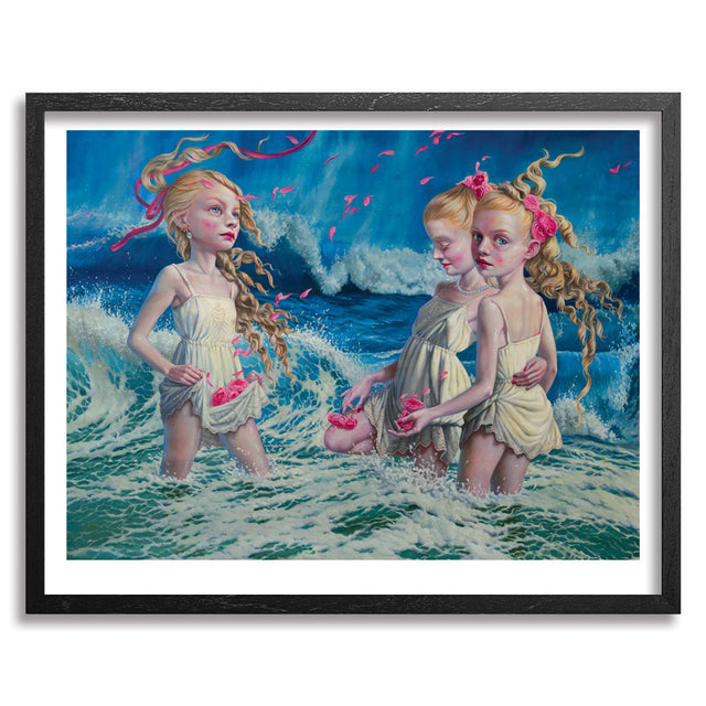 The Day When Time Stood Still Limited Edition Archival Pigment Prints on 290gsm Moab Rag Fine Art Paper by Jana Brike Graffiti Street Artist Modern Pop Art. "The painting title is a complete paradox, of course. It is connected to my perception of reality in meditative states. The actual theme is based both, on the girl-tribe relationship, and loosely on three graces story. It explores what is beauty to me. Beauty is a feeling. It is not to be merely pretty. It includes bravery, and wisdom, and strength, and imperfections that make one unique. Beauty is a feeling, and you need a feeling to perceive it. Beauty is a heart shining out, and you need your heart’s eye open to see it. This piece definitely was more ambitious than any of my previous work. More detailed. Also, before this one, I rarely if ever painted more than one figure. My characters were always lonely, trapped within their own self-sufficient universe. Starting from this one, relationships between the characters in my work have become more and more important for me." - Jana Brike