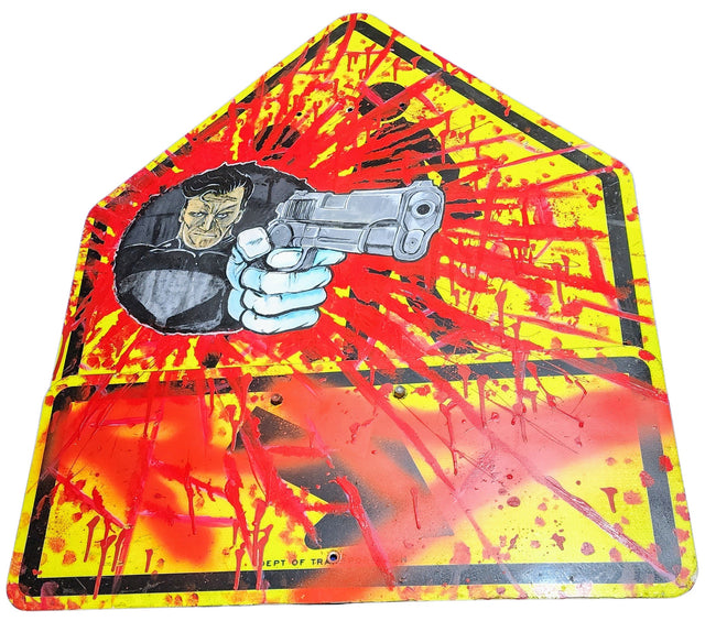 Punisher Crossing Original Street Sign Painting by RD-357 Real Deal One of a Kind Artwork on Real Metal Crosswalk Street Sign by Graffiti Art Pop Artist. 2012 Signed Mixed Media Acrylic & Spray Paint on Real Reclaimed NYC New York City Crossing Cross Walk Street Sign Painting Original Artwork Size 30x37.5 RD-357: Pioneering Street Pop Art on Urban Canvases RD-357, an artist known for his distinctive contribution to street pop art and graffiti artwork, has manifested his creativity through a unique, striking, and thought-provoking medium. His original piece titled "Punisher Crossing Original Street Sign Painting" encapsulates street art's raw essence while ingeniously infusing pop culture iconography elements. This work is a stellar example of RD-357's inventive use of everyday objects as canvases, transforming a mundane metal crosswalk street sign into a vibrant artwork that commands attention and sparks dialogue. The "Punisher Crossing" is a unique artwork that exudes the rebellious spirit and subversive edge often associated with street pop art. Created in 2012, this mixed media piece employs acrylic and spray paint on a real crossing sign measuring 30x37.5 inches. RD-357's choice to use an actual street sign as the foundation for his artwork not only repurposes the object but also embeds the art piece within the fabric of urban life it seeks to comment on. The sign, once a directive for pedestrians, now carries a powerful visual message, made all the more potent by its placement on an object of regulation and order. The Artistic Language of RD-357's Street Sign Paintings In "Punisher Crossing," RD-357 demonstrates a masterful control over color and composition. The background of the sign is ablaze with a vivid, almost violent splatter of yellow and red spray paint, reminiscent of the chaos and energy of city streets. Against this explosive backdrop, the figure of the Punisher is rendered with precision in acrylic, his stark, menacing presence immediately drawing the eye. The character's hand, outstretched and holding a gun, breaks the boundaries of the sign's frame, suggesting a defiance of constraints and a breaking free from imposed limits. RD-357's work is deeply embedded in the language of street pop art, a genre that combines the gritty, underground aesthetic of street art with the bright, graphic quality of pop art. His paintings, especially this piece, are a dialogue between the artist and the urban landscape, between the fictional characters of pop culture and the reality of the viewer's environment. By bringing the Punisher - a symbol of vigilante justice and anti-heroism - into the context of a crosswalk sign, RD-357 creates a juxtaposition that is at once startling and intriguing. The artwork becomes a statement on control and chaos, power and powerlessness, and the fine line between societal order and individual action. RD-357's Impact on Contemporary Street Art RD-357's contributions to the street art scene have been significant, and his influence can be seen in the way street pop art has evolved over the years. His artworks, particularly those on street signs, are more than mere paintings; they are interventions into the urban environment, which challenge the viewer to reconsider the role and potential of public space. The "Punisher Crossing" sign is emblematic of this approach, seamlessly integrating art into the city's daily liandlso elevating the discourse around street art. By signing his work, the artist claims ownership of a public domain piece, an act that is a form of artistic rebellion. The signature on "Punisher Crossing" is not merely a mark of authenticity; it is a declaration of presence, a proof of the artist's interaction with the world around him. Through works like this, RD-357 has etched his name into the annals of street pop art history, securing his place as a maverick who has expanded the possibilities of graffiti artwork. The "Punisher Crossing Original Street Sign Painting" by RD-357 stands as a testament to the power of street pop art to communicate, provoke, and inspire. By transforming a simple street sign into a complex and compelling work of art, RD-357 challenges perceptions, invites reflection, and continues influencing the ever-evolving narrative of street and graffiti art.