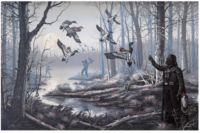 The High Ground Giclee Print by Dave Pollot Artwork Limited Edition Print on Canvas Graffiti Pop Street Artist. 2025 Signed & Numbered Limited Edition of TBD Artwork Size 20x13 Star Wars May the 4th Special Edition Print on Rolled Canvas. The High Ground Giclee Print by Dave Pollot: Star Wars in the American Wilderness The High Ground is a 2025 giclee print by Dave Pollot, a limited edition artwork measuring 20x13 inches on rolled canvas. Signed and numbered by the artist, this special edition was released to mark Star Wars Day, combining sci-fi iconography with classic Americana. Dave Pollot, known for recontextualizing pop culture into traditional landscapes and thrift store finds, brings Darth Vader, stormtroopers, and mallards into a serene wilderness hunting scene, transforming fan art into a contemplative and visually satirical piece within Street Pop Art & Graffiti Artwork. Star Wars and American Nostalgia Collide This artwork channels the quiet stoicism of mid-century American wildlife paintings, a genre associated with stillness, solitude, and reverence for nature. However, Pollot introduces an unexpected yet humorous disruption—Darth Vader, dressed in full regalia, holds a camouflage duck call and lifts his hand as ducks scatter across a frosty marsh. In the backdrop, stormtroopers pose as hunters with rifles raised, as if unaware they are participants in a parody. The distant trees and subdued color palette create a tranquil environment that is cleverly unsettled by these fictional intrusions. The Death Star hovers faintly in the misted moon, replacing the sun like an all-seeing presence. The balance between humor and reverence is where Pollot excels, subtly critiquing the commercialization of mythology while celebrating it at the same time. The Satirical Language of Dave Pollot Dave Pollot is an American artist celebrated for taking discarded art and reimagining it through the lens of popular culture. His works often remix vintage aesthetics with modern characters from video games, films, and television, turning forgotten or ignored canvases into sharply observed commentaries. The High Ground follows this trajectory by preserving the painting’s original sentiment—peaceful wilderness and natural observation—but replacing the human subjects with galactic legends. This method turns the familiar into the surreal and invites viewers to reassess both the imagery and the context. It functions both as a homage and a gentle subversion, seamlessly embedding Star Wars lore into the pastoral. Modern Street Pop Art on Traditional Canvas The High Ground is not just a novelty print for science fiction fans; it is a deliberate exploration of cultural layering. In the context of Street Pop Art & Graffiti Artwork, it utilizes mashup aesthetics to reflect how pop culture infiltrates memory and collective nostalgia. By printing on canvas and mimicking classical wildlife art, Pollot bridges the distance between digital-age fandom and analog artistic traditions. Released as a limited edition for Star Wars May the 4th, the print resonates beyond franchise loyalty. It becomes a narrative about cultural saturation, about how icons like Darth Vader are not simply fictional—they inhabit our landscapes, our metaphors, and our humor. Dave Pollot’s The High Ground embodies this ethos with cleverness and craftsmanship, making it a notable piece within contemporary collectible fine art.