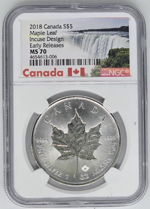 2018 Diseño de hoja de arce incrustado $5- MS 70 | Moneda de cinco dólares de plata de Canadá NGC, clasificada, coleccionable, auténtica, rara, conmemorativa, con losa mundial, lanzamientos tempranos, etiqueta de las Cataratas del Niágara.