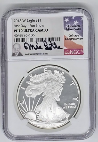 Dólar de plata American Eagle 2018 W - PF 70 Ultra Cameo Fun Show Primer día | Moneda calificada NGC Slabbed Auténtica colección rara firmada por Mike Castle.