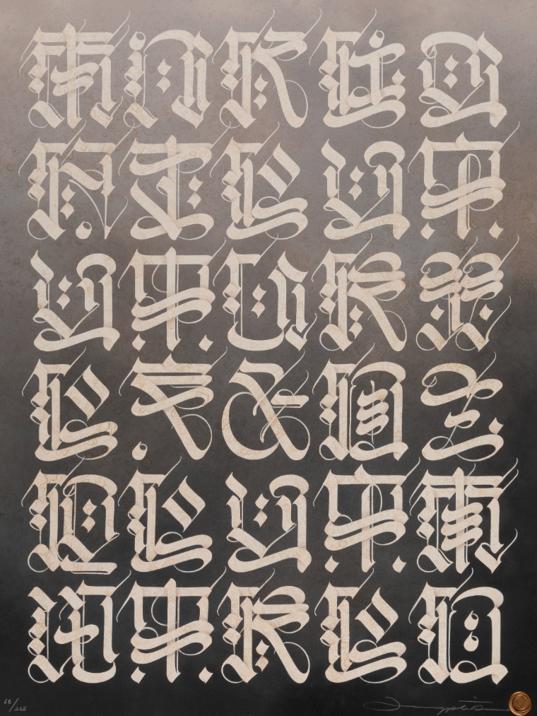 Musashi es una impresión giclée de edición limitada de 2024 del artista Cryptik, afincado en Los Ángeles. Lanzada en una edición numerada a mano de 263 ejemplares, esta obra de 45,7 x 61 cm está impresa en papel de algodón de bellas artes con bordes irregulares, lo que refuerza su estética ceremonial y artesanal. La pieza es un laberinto caligráfico, construido con una escritura estilizada que refleja tanto sistemas lingüísticos antiguos como la estética del grafiti contemporáneo. Ejecutada con el estilo característico de Cryptik, la impresión utiliza precisión geométrica y un denso ritmo visual para evocar lo sagrado y lo esotérico. El título hace referencia a Miyamoto Musashi, el legendario espadachín y filósofo japonés del siglo XVII, y la obra canaliza esta influencia a través de la estructura disciplinada y la repetición meditativa de cada letra.