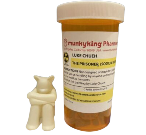 El Prisionero, una figura de vinilo exclusiva de Kickstarter de 2018 del artista Luke Chueh, lanzada en una edición limitada de 213 piezas, brilla en la oscuridad con yoduro de sodio. Esta versión única de la serie El Prisionero está esculpida en un tono blanquecino que emite un luminoso resplandor verde en la oscuridad. Empaquetada en un envase tipo frasco de pastillas con una bolsa de algodón y una etiqueta de prescripción, la figura posee un gran peso tanto visual como temático. Basada en la pintura original de Chueh, El Prisionero explora el cautiverio emocional y farmacológico, transformando un simple oso sentado en un conmovedor símbolo de la lucha interna. La referencia al yoduro de sodio vincula la figura con el tratamiento radioactivo y la intervención médica, ampliando el alcance de la obra para incluir temas como la curación tóxica y el daño invisible. Esta edición que brilla en la oscuridad consolida aún más la obra de Chueh dentro del diálogo del Arte Pop Urbano y el Grafiti, al convertir el sufrimiento en un objeto de colección brillante que invita a la reflexión.
