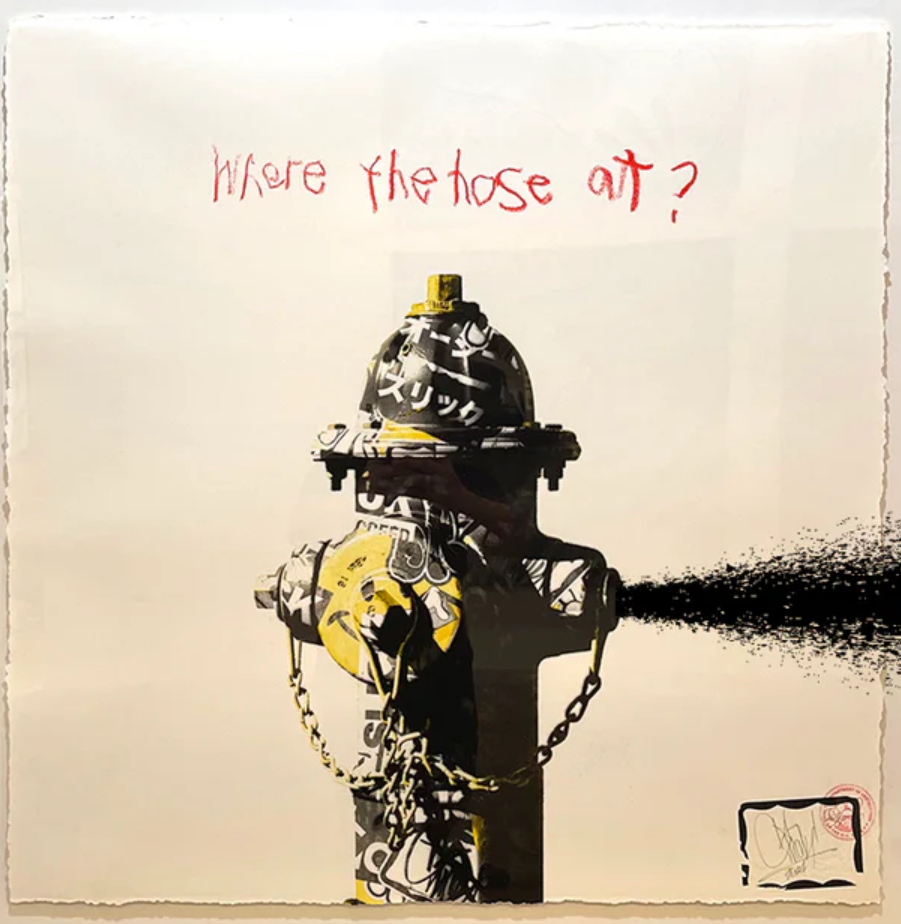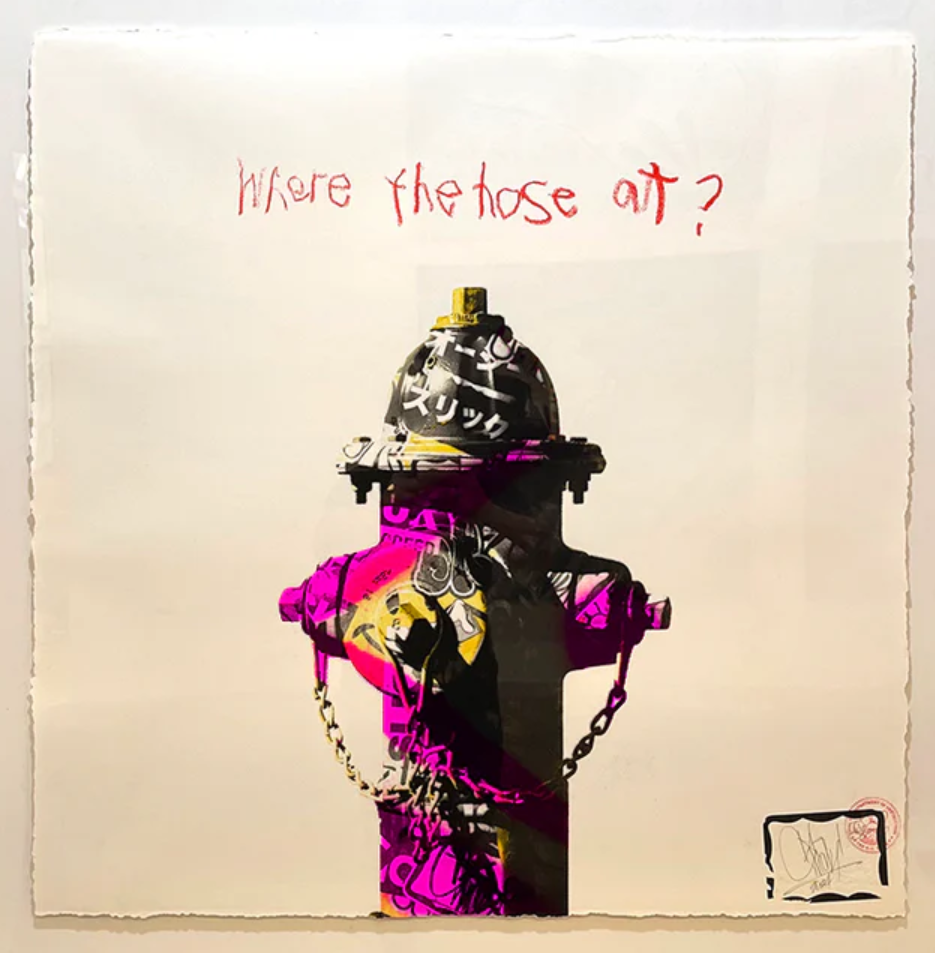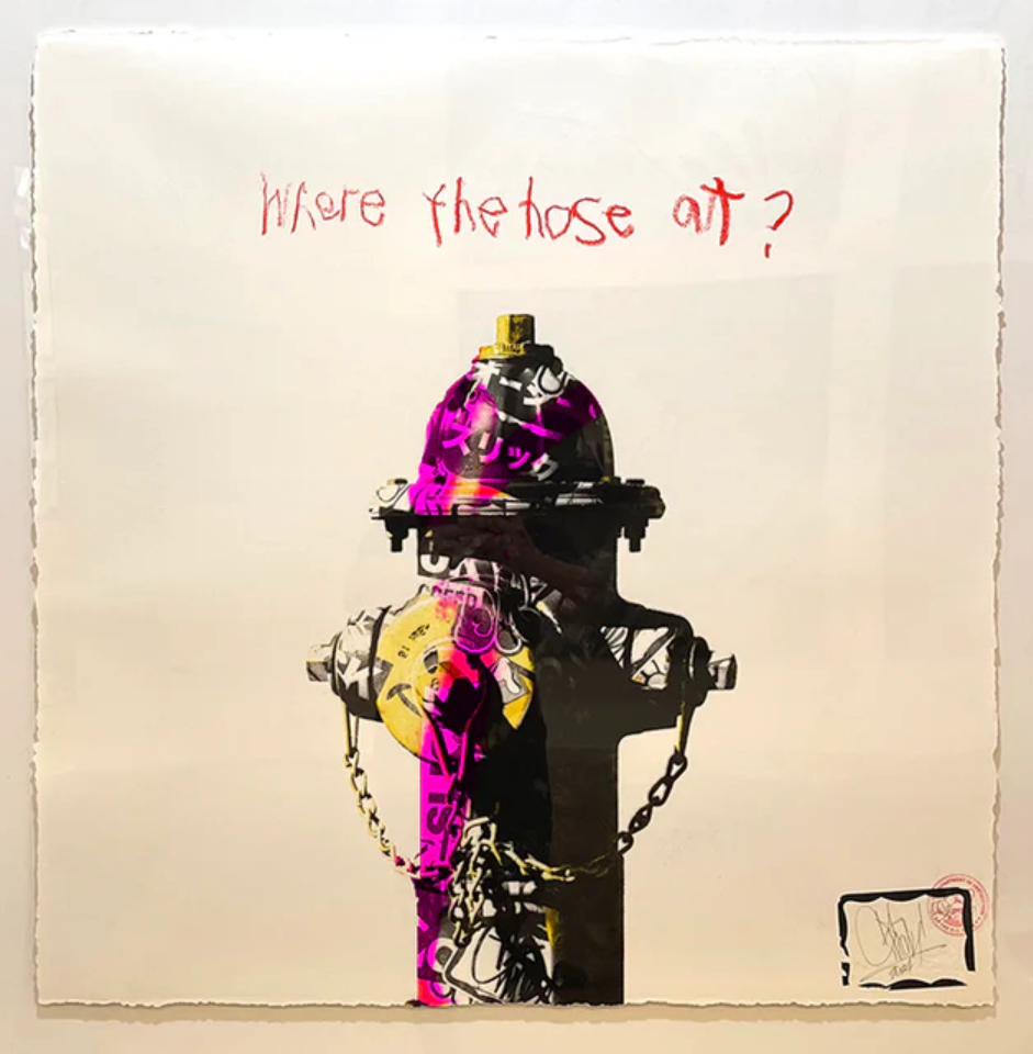 Where The Hose M30 es una impresión giclée de 2025 intervenida a mano por OG Slick, presentada en una edición limitada de 25 ejemplares. Cada impresión de 76x76 cm está realizada en papel de bellas artes de 310 g/m² con bordes irregulares, firmada y numerada por el artista, y acabada a mano de forma única con pintura en aerosol y diversas técnicas de grafiti. El elemento central es una boca de incendios —pintada, con pegatinas y transformada— sobre un fondo austero, con la pregunta escrita a mano «¿Dónde está la manguera?» flotando encima en una divertida tipografía roja. La imagen fusiona un ingenioso juego de palabras con realismo urbano, combinando una ejecución visual impecable con una irreverencia cultural cruda. Cada versión de HPM es diferente, presentando su propia variación de salpicaduras de pintura, aplicación de aerosol y marcas de intervención, reforzando la individualidad y la espontaneidad rebelde inherentes al arte pop urbano y al grafiti.
