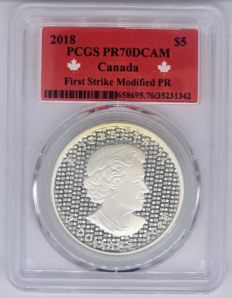 Pièce de 5 $ Feuille d'érable du Canada 2018, 30e anniversaire - PR 70 DCAM | Pièce de cinq dollars en argent certifiée PCGS, pièce de collection authentique et rare, commémorative, première frappe modifiée PR.