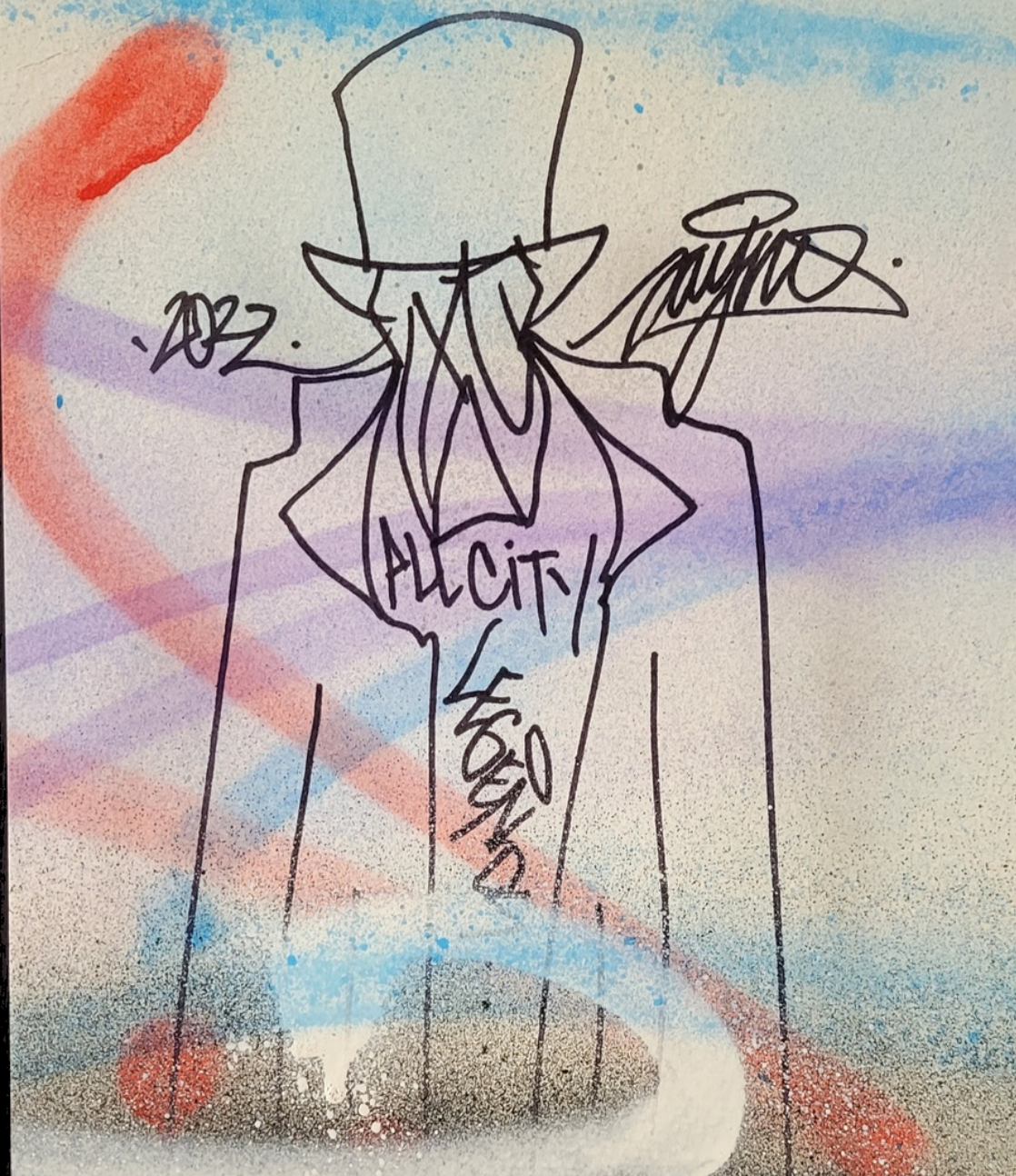 « All City Legends » est une œuvre originale de 2022, réalisée à la bombe aérosol et au marqueur par Optimo NYC sur papier beaux-arts de 18 x 23 cm. Cette œuvre unique en son genre capture l'essence même du graffiti – l'esprit de la ville – à travers une figure minimaliste, une phrase codée et les textures superposées du mouvement urbain. Le personnage principal, esquissé dans le style fluide et inimitable d'Optimo, porte un long manteau et un haut-de-forme, une présence stylisée récurrente dans son œuvre. Les mots « All City Legends » sont inscrits à la main sur le torse du personnage en lettres capitales, fusionnant figure et texte en un seul symbole de réputation, de mouvement et de légende. Le fond présente de doux dégradés de peinture rouge, violette, bleue et blanche, se croisant en diagonale comme des traînées de lumière ou des échos de la peinture. Il évoque la brume atmosphérique des gares et des dépôts de marchandises recouverts de graffitis, tout en conservant une clarté abstraite propre à la composition des beaux-arts.