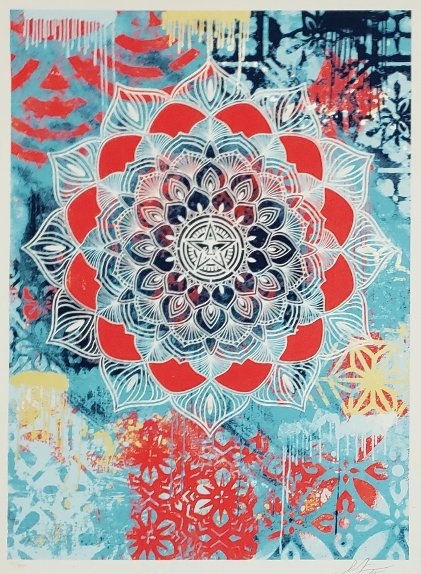 Au premier abord, Chaos Mandala évoque un symbole de géométrie sacrée, avec ses pétales symétriques et son équilibre radial rayonnant depuis un emblème central en forme d'étoile, OBEY. La netteté des lignes du mandala contraste avec un fond d'une richesse chaotique, composé de pochoirs usés, de textures projetées, de coulures et de fragments d'affiches délavés. Cette tension entre précision et érosion organique incarne la dualité que Shepard Fairey explore souvent dans son œuvre. Les éléments de fond simulent la dégradation urbaine, rappelant le bruit visuel des murs couverts de tracts, de propagande et de graffitis. L'utilisation des techniques de pochoir et de sérigraphie renvoie directement aux méthodes du street art, tandis que le choix des couleurs – rouge vif, bleu glacé et crème doux – confère à l'œuvre une présence puissante tout en invitant à un examen attentif de sa surface stratifiée.