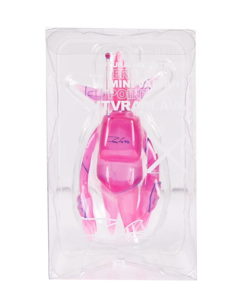 La figurine FL-001 Mini Pointman en vinyle rose transparent est une sculpture saisissante en édition limitée 2025 de l'artiste américain Leonard McGurr, connu dans le monde du street art, du pop art et du graffiti sous le nom de Futura 2000. Figure emblématique du graffiti abstrait dans le New York des années 1970, Futura a exercé une influence qui dépasse largement les rues et les wagons de métro de ses débuts. Cette figurine en vinyle est une représentation compacte mais percutante de son personnage iconique, Pointman. Mesurant seulement 5 x 15 cm, elle est présentée dans une boîte transparente. Sa coque rose translucide éclatante et ses fins détails bleus transforment cette petite forme en un point focal plein d'énergie, rayonnant du dynamisme visuel qui caractérise la carrière de McGurr, riche de plusieurs décennies.