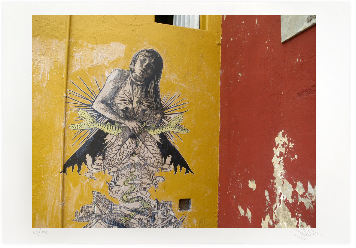 Kamayura Oaxaca 2013 reflète l'esthétique complexe du papier découpé et le récit humanitaire qui caractérisent le langage visuel de Swoon. La figure représentée – mi-guerrière, mi-sirène – serre deux crocodiles dans ses bras tandis qu'une armure d'écailles recouvre ses jambes. Des lignes rayonnantes s'étendent de son dos comme une auréole, tandis qu'en dessous se déploie un collage complexe de serpents, d'éléments architecturaux et de flore, le tout exécuté avec une grande précision. Ces motifs fusionnent le symbolisme indigène et la dégradation urbaine contemporaine, évoquant les thèmes de la transformation, de la résilience et de l'interdépendance des environnements naturels et construits. Le mur en stuc jaune vif et rouge profond, derrière l'affiche collée, crée un contraste de couleurs dynamique, ancrant l'image dans son contexte urbain d'origine tout en renforçant la présence mythique de la figure centrale.