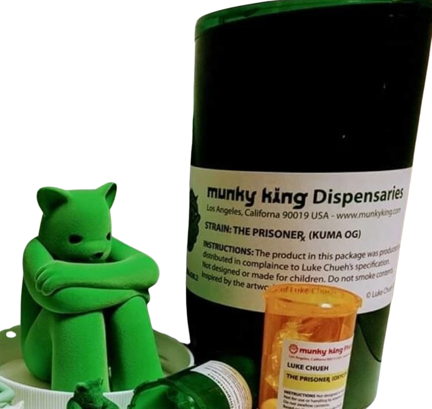 Kush XL 6in The Prisoner est bien plus qu'une simple figurine de collection : c'est une représentation sculpturale d'une vérité culturelle. Limitée à seulement 93 exemplaires exclusifs Kickstarter, elle revêt une valeur considérable pour les collectionneurs, non seulement en raison de sa rareté, mais aussi grâce à son message émotionnel brut et sans filtre. L'emballage n'est pas décoratif. Il fait partie intégrante du récit, renforçant le statut de la figurine comme symbole de la dépendance médicamenteuse. La couleur verte et l'étiquette inspirée des dispensaires introduisent un commentaire subtil sur la normalisation croissante du cannabis, à la fois comme soulagement et comme béquille, élargissant ainsi la critique de Chueh au-delà des seuls médicaments. Dans le registre du Street Pop Art et du Graffiti, la figurine fonctionne comme une fresque murale miniature : portable, puissante et engagée. Avec cette édition XL, Luke Chueh transforme les jouets design en plateformes de dialogue sur la santé mentale, utilisant le vinyle, le flocage et la forme pour refléter à la fois la vulnérabilité individuelle et la réponse systémique.