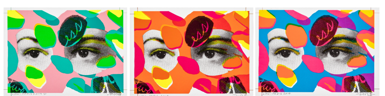L'ensemble propose trois palettes de couleurs distinctes – des fonds à dominante rose, orange et bleue – chacune rehaussée de formes nettes et contrastées dans des tons de vert électrique, rose vif, jaune éclatant et bleu saturé. Le rendu pointilliste des yeux confère une texture d'impression vintage, juxtaposée aux aplats de couleurs contemporains. Ce contraste délibéré de styles d'impression accentue la sensation de mouvement et de tension au sein de l'œuvre, tout en témoignant de la maîtrise des techniques de sérigraphie par Insect. La réalisation artisanale des impressions garantit une richesse de couleurs et une précision de superposition exceptionnelles, permettant à chaque panneau de s'affirmer à la fois comme une pièce unique et comme élément d'un triptyque cohérent.
