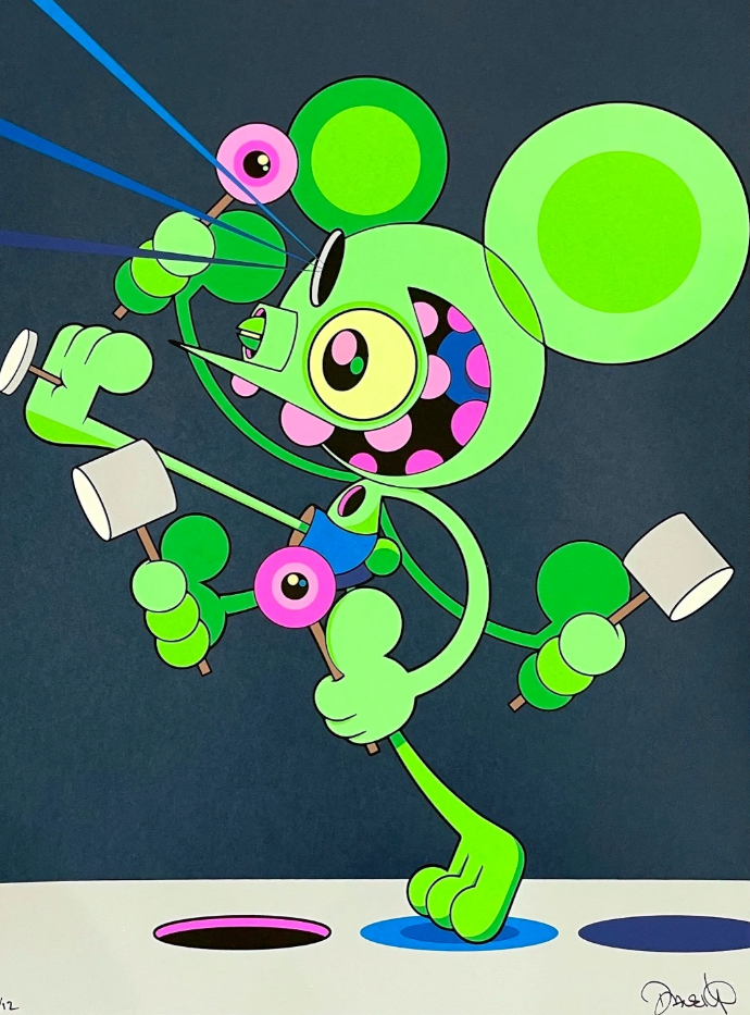 Le personnage de « Marching to Oblivion Nightshift » est une version évoluée du Space Monkey emblématique de Dalek, apparu pour la première fois dans ses œuvres du début des années 2000. Réalisée dans des tons contrastés de vert, de violet et de bleu, la figure jongle avec des maillets et des orbes, arborant une expression oscillant entre joie frénétique et précision mécanique. Les formes, à la fois nettes et ludiques, se situent à la frontière entre les dessins animés du samedi matin et l'esthétique du graffiti. Ses membres hypertrophiés, ses yeux démesurés et sa posture dynamique projettent énergie et volume, qualités essentielles au Street Pop Art et au graffiti. Ces formes émergent du fond avec une netteté saisissante grâce à la précision de la sérigraphie, où chaque couleur est appliquée à la main, l'une après l'autre. L'œuvre joue avec la profondeur spatiale et l'illusion de surface, créant à la fois un spectacle et une réflexion sur la répétition et la performance.