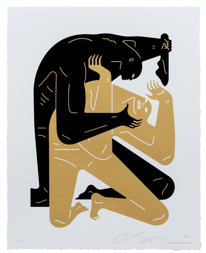 Cette composition saisit un échange violent entre deux figures humanoïdes abstraites, réalisées en noir mat et or métallique sur un papier blanc éclatant. L'une domine l'autre, brandissant une arme, figée au paroxysme de la confrontation. Chaque élément – posture, forme, espace négatif – est travaillé avec précision pour communiquer la pression, la tension et l'effondrement inévitable. À la différence du street art plus traditionnel, foisonnant de tags et de marques expressives, l'œuvre de Peterson offre une précision clinique qui confère au récit une dimension monumentale. Son utilisation de l'or, contrastant avec le noir profond, aplatit l'espace, mais amplifie la dualité symbolique : oppresseur et opprimé, domination et défense, ténèbres et pouvoir.