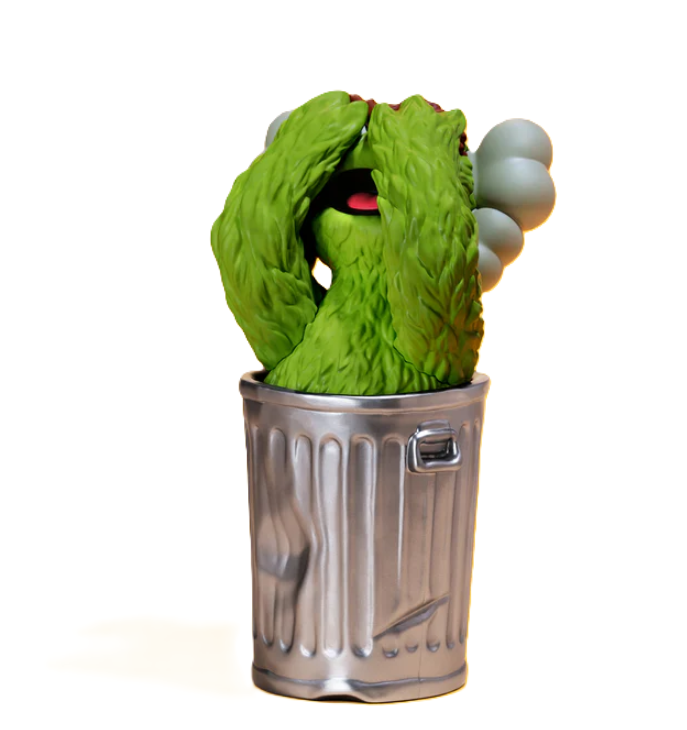 Oscar the Grouch has long represented countercultural humor, cynicism, and outsider identity within children’s television, making him a natural subject for reinterpretation by KAWS. Brian Donnelly applies his signature sculptural approach to the character, maintaining Oscar’s textured green fur while introducing the exaggerated cartoon anatomy and refined surface detailing associated with KAWS collectibles. The trash can features realistic dents and metallic finishes, grounding the piece in physical realism while contrasting with the playful stylization of the figure itself. The sculptural form balances nostalgia with contemporary design, transforming a familiar television character into a gallery-worthy object aligned with Street Pop Art & Graffiti Artwork traditions that elevate everyday icons into fine art contexts.
