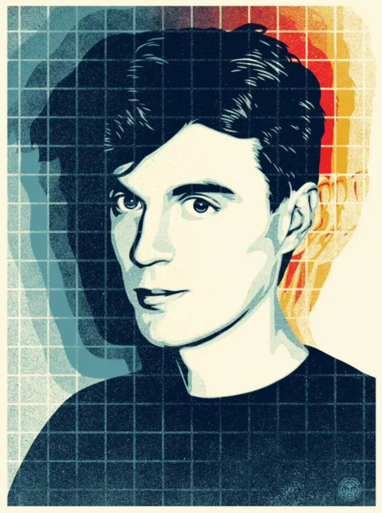 La réinterprétation par Shepard Fairey de la photographie de Bobby Grossman s'inscrit pleinement dans l'esprit du Street Pop Art et du graffiti. À travers ses superpositions de grilles caractéristiques, sa palette de couleurs restreinte et ses ombres marquées, Fairey crée une tension visuelle entre formalité et rébellion. Son utilisation du contraste et son style confèrent au portrait une puissance souvent réservée à l'art de propagande, témoignant de son intérêt constant pour les messages et l'iconographie politiques. La sérigraphie, technique profondément ancrée dans le street art et la culture DIY, renforce le lien de l'œuvre avec l'esthétique underground. La technique de Fairey amplifie le regard de Byrne, faisant du portrait un symbole de défi créatif et de sophistication urbaine.