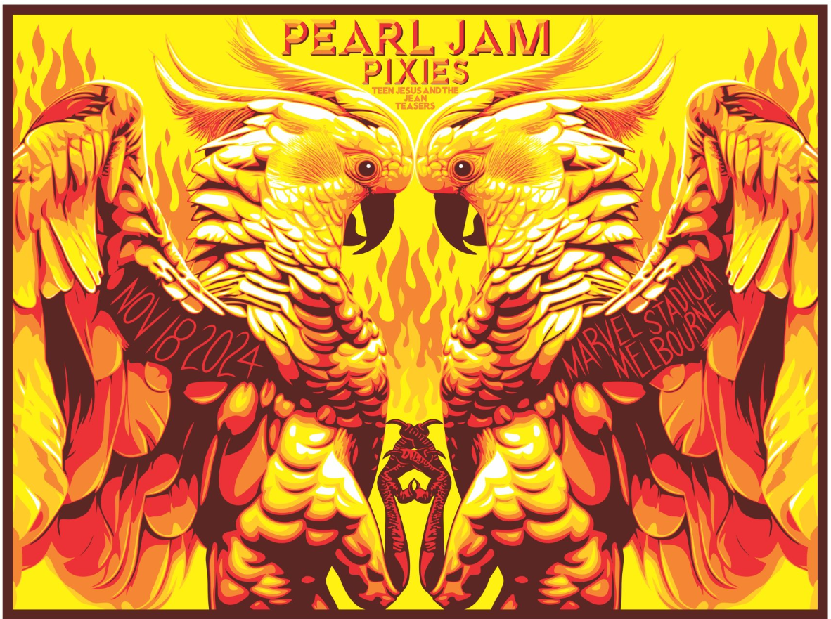 L'œuvre présente une composition explosive en miroir mettant en scène deux cacatoès jaunes – originaires d'Australie – engagés dans une confrontation audacieuse et symétrique. Leurs ailes s'embrasent, rendues dans une palette contrastée de pourpre, d'ambre et de jaune électrique. Le plumage des oiseaux palpite d'intensité, chaque forme étant soigneusement délimitée par la technique graphique précise de Frost. Leurs serres se rejoignent au centre, s'entremêlant dans un geste serré qui suggère solidarité, puissance et résistance. Entre les ailes, des flammes s'élèvent, incarnant la chaleur spirituelle et littérale de l'estampe – reflétant le feu et l'urgence qui ont toujours caractérisé la musique de Pearl Jam. Sur une aile est inscrite la date du concert, NOV 18 2024, tandis que l'autre aile indique le lieu : MARVEL STADIUM MELBOURNE. La typographie est parfaitement intégrée au design, servant à la fois fonction et forme, puisant ses racines dans le style graffiti mais raffinée par le prisme de la sérigraphie d'art.