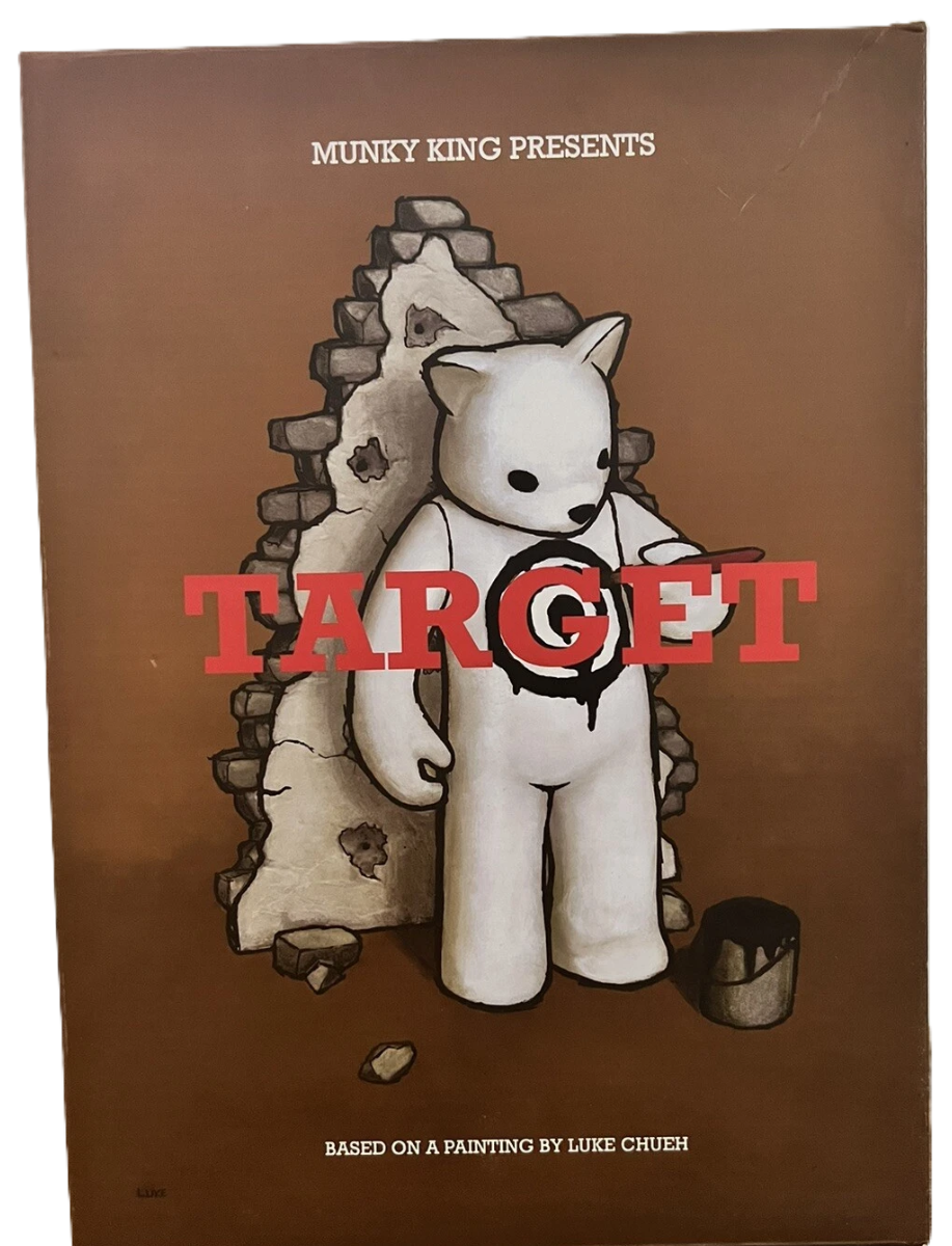 Luke Chueh, artiste américain reconnu pour son exploration des traumatismes personnels et de la satire grinçante à travers des personnages anthropomorphes minimalistes, mêle sans cesse iconographie pop et expériences humaines brutes. Dans cette sculpture, il manipule la mignonnerie d'un ours de dessin animé et l'insère dans un contexte de conflit et de forte instabilité émotionnelle. Il en résulte une métaphore visuelle poignante : une mise à nu auto-infligée, où l'artiste devient littéralement la cible. « Target Black HPM Shoot To Kill » n'est pas qu'un simple objet de collection. C'est une réflexion sur la projection de la douleur, la construction de l'identité et la manière dont l'art reflète le malaise profond de la vie moderne avec une simplicité saisissante et une honnêteté percutante.