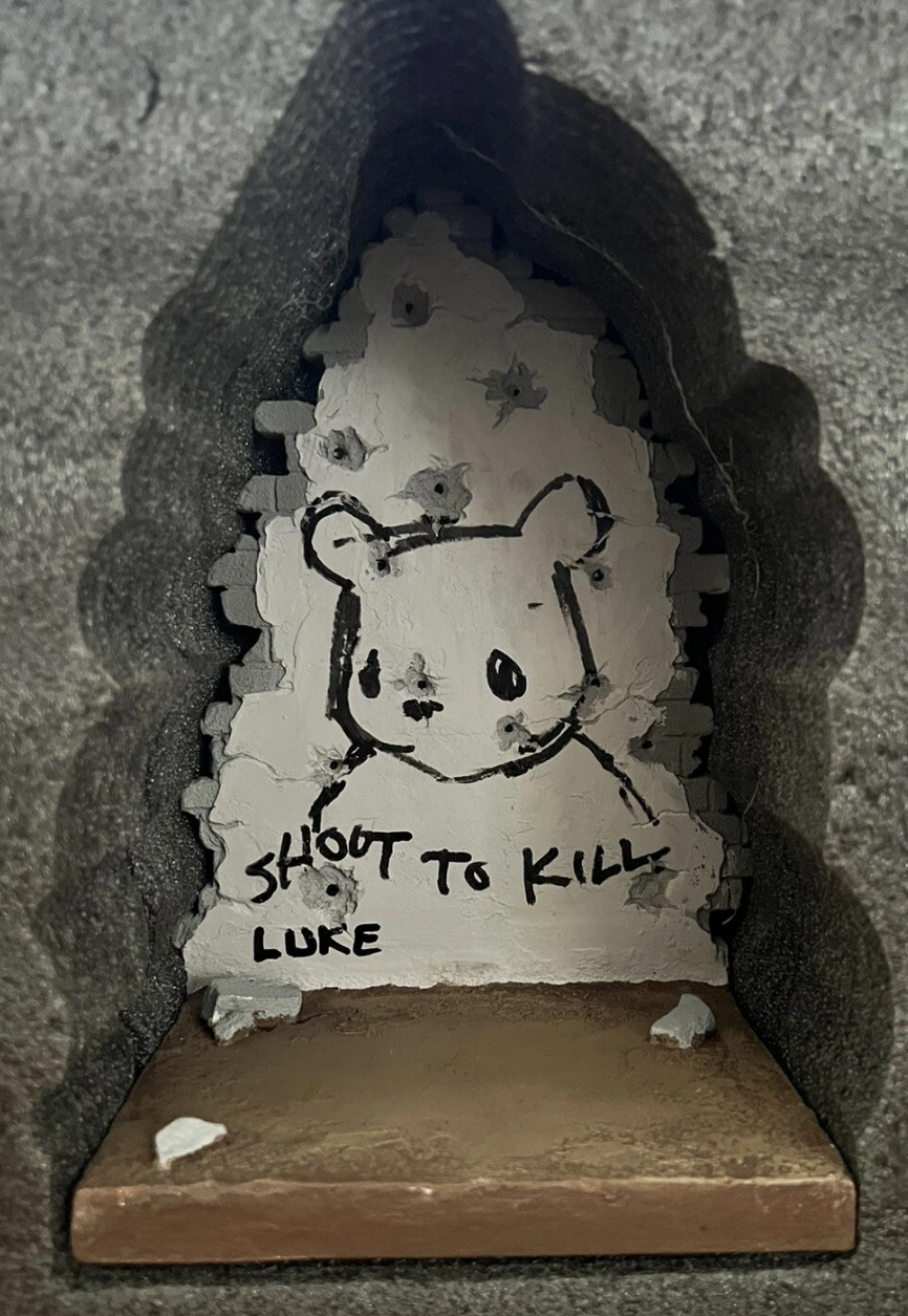 Cette sculpture de 16,5 x 26,5 cm capture l'essence du style narratif de Chueh. Un ours blanc, solennel et impassible, tient fermement un pinceau et un seau rouge, arborant fièrement une cible noire fraîchement peinte sur sa poitrine. Derrière lui, un mur de béton fragmenté est criblé d'impacts de balles et orné d'un dessin enfantin représentant l'ours lui-même, les yeux grands ouverts, au milieu des décombres. Les mots « Tirer pour tuer » amplifient la confrontation de l'œuvre avec les thèmes de la vulnérabilité, du ciblage et de l'exposition émotionnelle. Chaque élément de la sculpture, de l'expression inexpressive du personnage au socle granuleux et aux marques façon graffiti, pousse le spectateur à s'interroger sur la frontière entre compassion et complicité dans un monde désensibilisé à la violence.