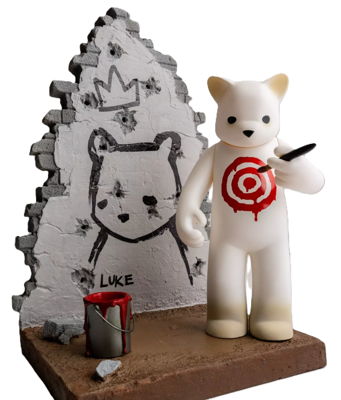 Cette figurine de collection mesure 16,5 x 26,7 cm et est réalisée en vinyle avec un socle sculptural en techniques mixtes. Elle représente l'emblématique ours de Chueh, dans une palette minimaliste, peignant une cible concentrique rouge sang sur sa poitrine, devant un mur fissuré criblé de balles. Le décor, orné d'une tête d'ours et d'une couronne dessinées à la main et signées par Luke Chueh, symbolise la vulnérabilité. Cette version, connue sous le nom de Red King n° 2, fait partie d'une sous-édition limitée à 250 exemplaires. Chaque exemplaire est unique, avec des personnalisations réalisées à la main dans un style graffiti sur le socle, faisant de chaque pièce une œuvre d'art peinte à la main. La présence du pinceau et du seau amovibles confère à la figurine une dimension tragique, voilant la frontière entre émancipation et autodestruction.