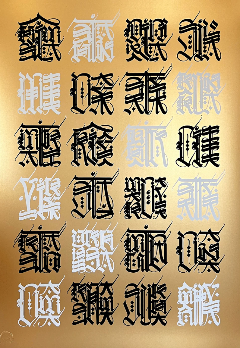 Cryptik’s work is deeply rooted in Eastern philosophy, sacred geometry, and the transformative power of language. In *24 Virtues Gold*, calligraphy becomes both visual art and spiritual architecture. The sharp precision of the black characters contrasts with lighter, almost ethereal white forms, suggesting duality: seen and unseen, material and spiritual, action and intention. The gold field acts as a unifying ground, symbolizing enlightenment, wisdom, and value beyond the material. Rather than reading the characters literally, the viewer experiences them rhythmically, absorbing meaning through form, repetition, and balance.