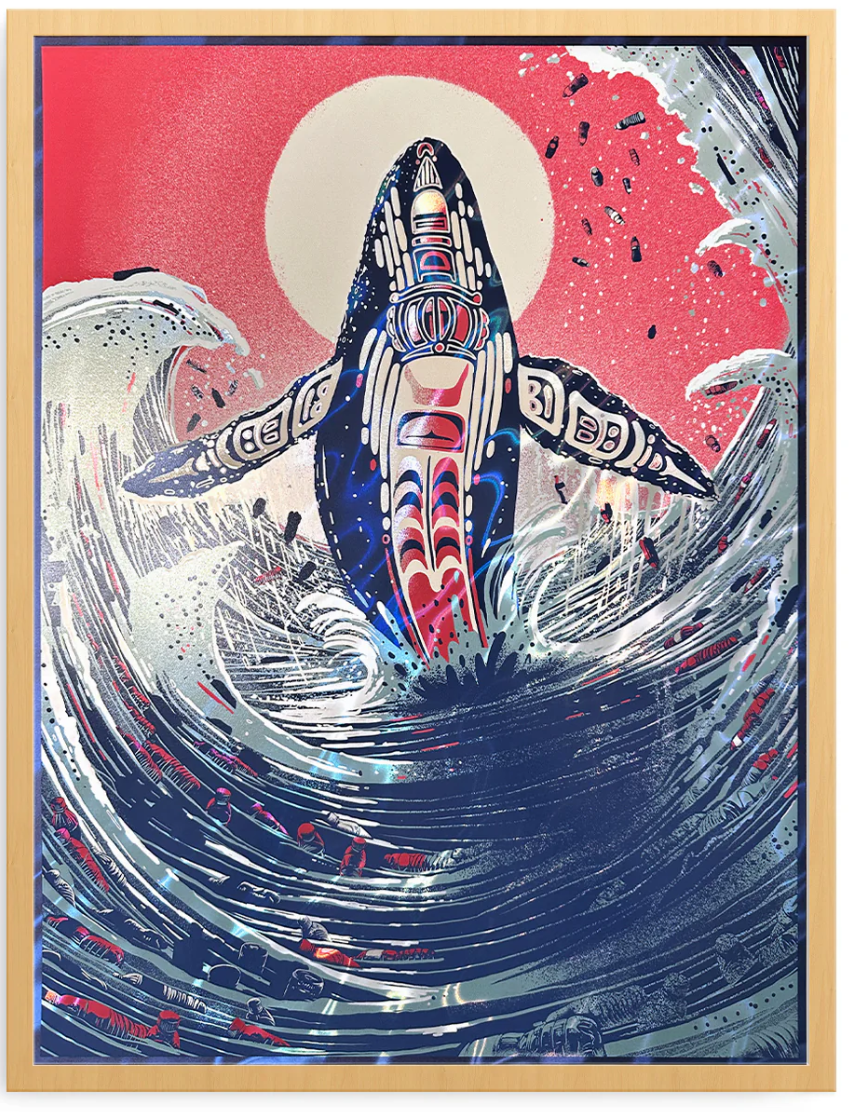 The orca at the center of Breach Sunset is not just a marine creature but a totem of strength and spiritual force. Its body is rendered in an intricate pattern that recalls indigenous Pacific Northwest Coast art while simultaneously evoking cybernetic overlays and graffiti iconography. The decision to stage the breach with a frontal perspective forces the viewer into the moment, as if physically caught in the explosion of water and light. The crimson background and white sun intensify this sensation—emphasizing energy, elevation, and rupture. The composition reflects both the sacredness of nature and the cultural remix aesthetic of street-based art movements. By fusing mythic animal iconography with postmodern urban form, Raid71 offers a visual thesis on cultural convergence and environmental consequence.