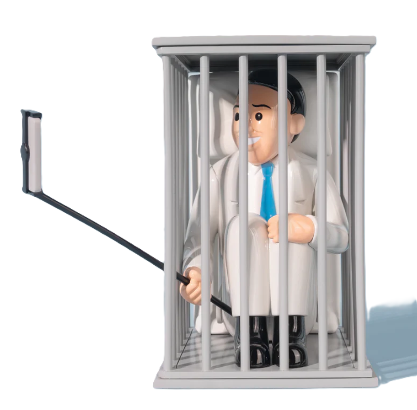 The sculpture depicts a smiling man dressed in a neutral suit with a bright blue tie, posed beside a small barred cage while holding a selfie stick. In one configuration, the figure sits comfortably outside the cage, smiling toward the viewer, while in another, he is enclosed within it. The contrast between the character’s cheerful expression and the implied imprisonment is central to the work’s meaning. This visual contradiction reflects Cornellà’s trademark approach, where exaggerated positivity masks deeply uncomfortable truths. The clean lines, glossy vinyl surface, and cartoon proportions reinforce the deceptively playful aesthetic, drawing viewers in before confronting them with the darker implications beneath the surface.