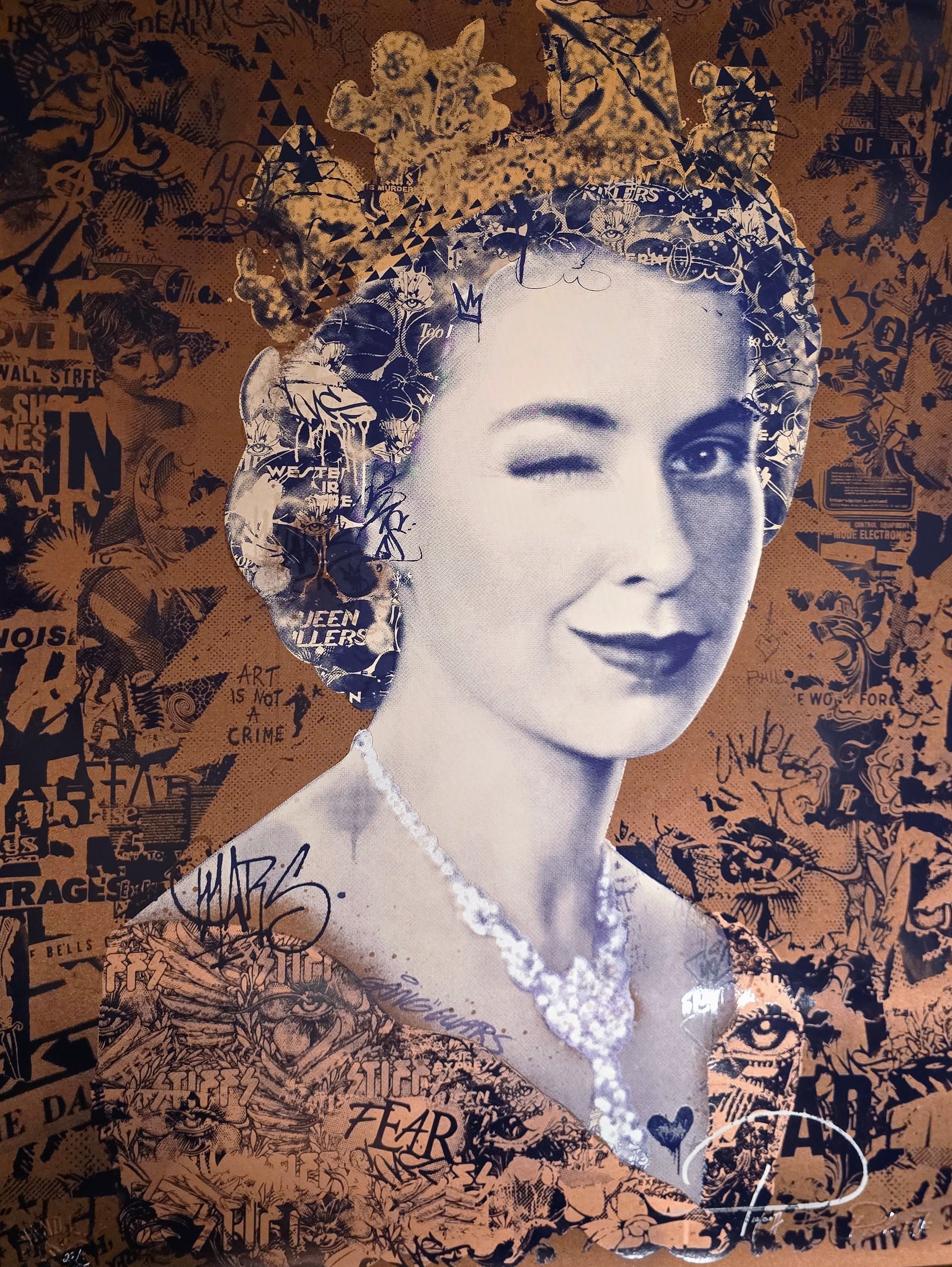 Let It Reign Copper by Prefab77 is a commanding archival pigment print that merges regal portraiture with the layered visual language of Street Pop Art & Graffiti Artwork. The composition centers on a poised female figure styled in reference to Queen Elizabeth II, rendered in cool monochrome tones that contrast against a warm copper-infused background. The subject’s composed expression and classic jewelry evoke tradition, continuity, and authority, while the surrounding field of graffiti fragments, stenciled imagery, and collage textures destabilizes the sense of institutional permanence. Printed on 300gsm Somerset fine art paper, the surface supports the richness of the copper tones and deep blacks, reinforcing the work’s tactile and visual intensity.
