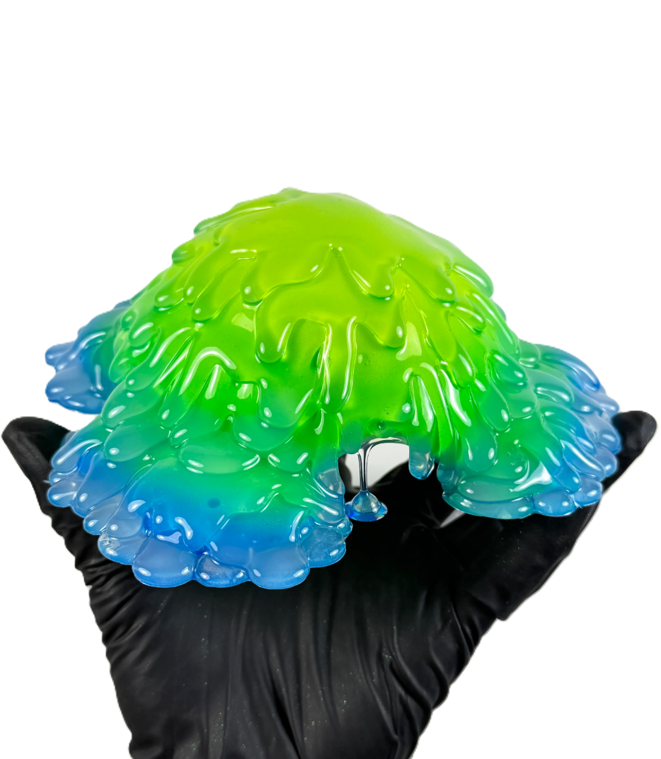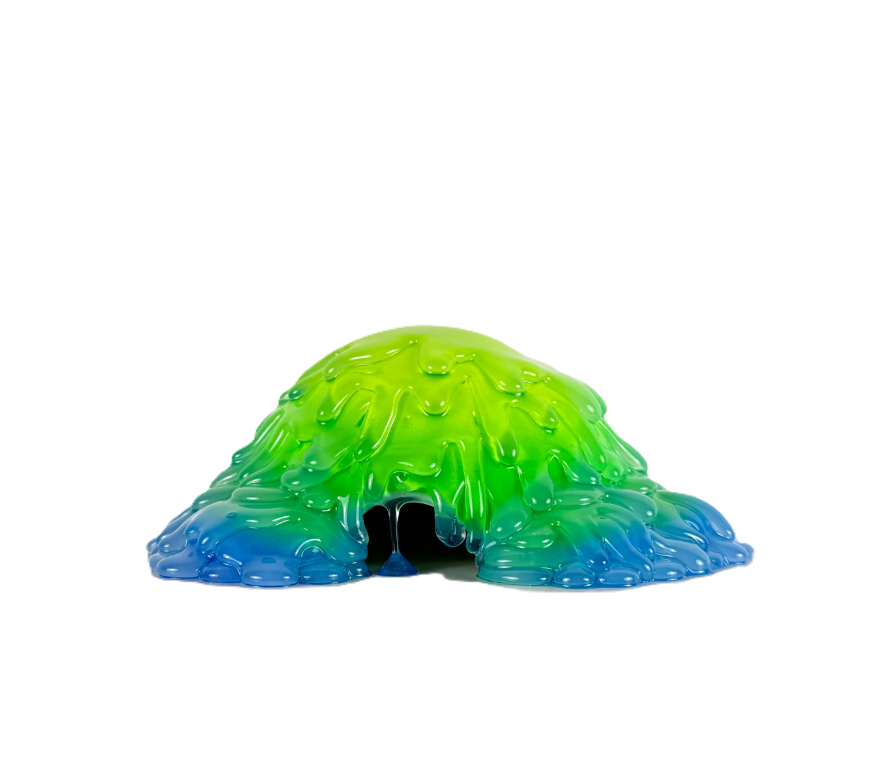 The defining visual hook of this sculpture is its ooze structure, where the glossy mound appears to drip toward the perimeter, framing a darker hollow that suggests an opening or shelter. That cave-like negative space changes how the piece behaves in a room, because it creates a natural focal point and a sense of depth that shifts with viewing angle and lighting. The green-to-blue palette reinforces the impression of something biological or aquatic, like a growth, tide pool, or mineral deposit, while still staying firmly in the pop-forward world of bright, saturated color design. The surface reads as wet and reflective, with rounded drip shapes that look suspended mid-flow, an effect that turns stillness into implied motion. This is part of what makes the work feel contemporary without leaning on tech references, because the object communicates through finish, color intensity, and silhouette in a way that aligns with how people visually navigate images today, while still being rooted in material and craft.