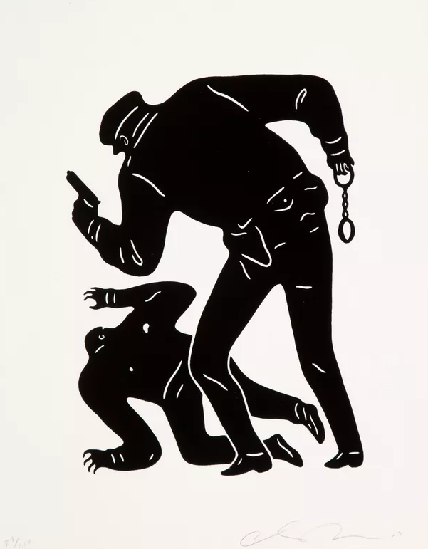 Cleon Peterson was born in 1973 in the United States and continues to create work that deeply engages with themes of chaos, institutional abuse, and systemic violence. A former street artist who has also worked in illustration and fashion, Peterson often centers his practice around the representation of violent struggle. His works are filled with archetypal figures that reenact the brutal power plays of modern society. Police Shooting Black stands out in his body of work not only for its limited edition fine art format but for its focused depiction of racialized police violence. It is not an ambiguous image. The figures speak with immediacy, channeling real-world incidents into high-contrast allegory. The facelessness of both the oppressor and the oppressed creates a disturbing universality, implicating systems rather than individuals.
