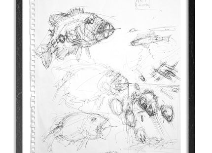 "My first batch was done in 2010/2011 and showed during the World's Largest Crappie Festival in Water Valley Mississippi, that was awesome. All are were made using pen, ink, and acrylic. My father was a B-26 pilot and my dad helped instill the interest in the subject. Two of the pieces feature a rock bass morphed with a B-26. These are completely different from what I normally do, whatever 'normal' means. Anyway, these were just a lot of fun to do. Whereas some of the intense pieces that I do I feel I have to do, as to purge it from my system, which works half the time (I tend to carry that stuff with me). I wanted to do these for fun and are a great distraction." - Derek Hess