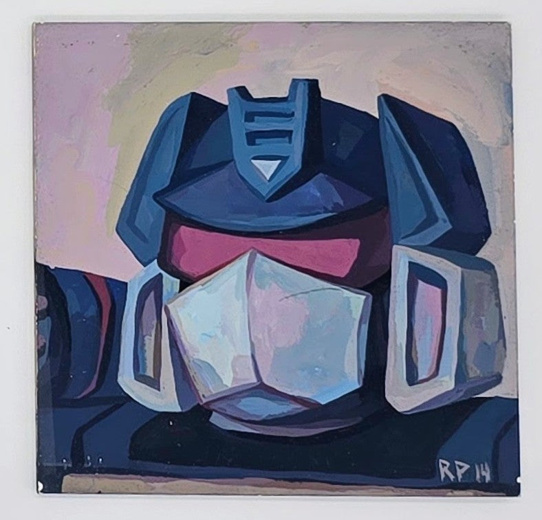 Soundwave is one of the most recognizable characters from the Transformers franchise, appearing across comic books, animated television shows, and blockbuster films. Known for his stoic demeanor and unique cassette deck design, Soundwave holds a special place in science fiction and popular culture. Pellegrino’s interpretation emphasizes the character’s angular, mechanical features, rendered in bold, dynamic strokes that highlight his presence as both a machine and a personality. The painting’s muted yet vivid color palette captures the balance between Soundwave’s cold, robotic nature and his enigmatic role as a loyal yet calculating figure.