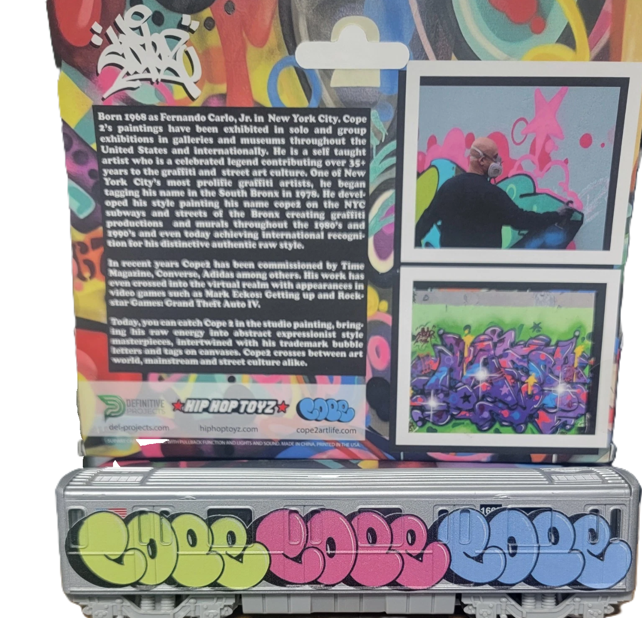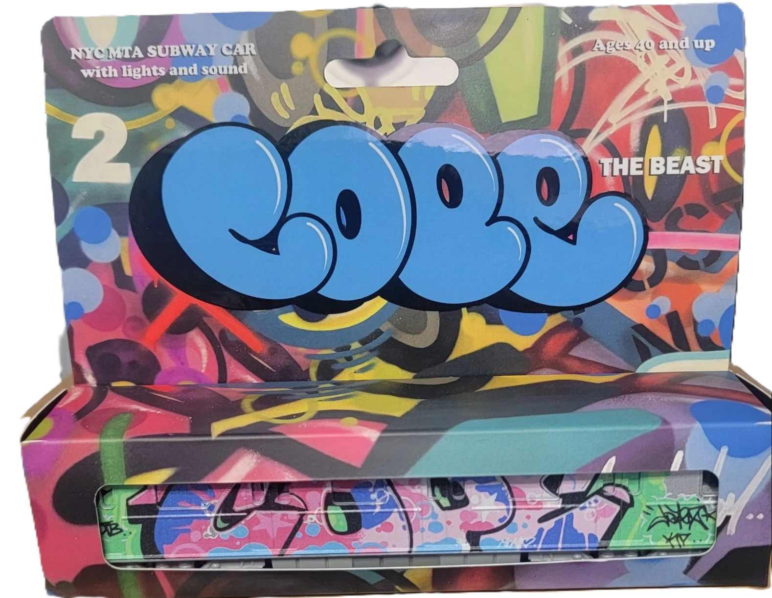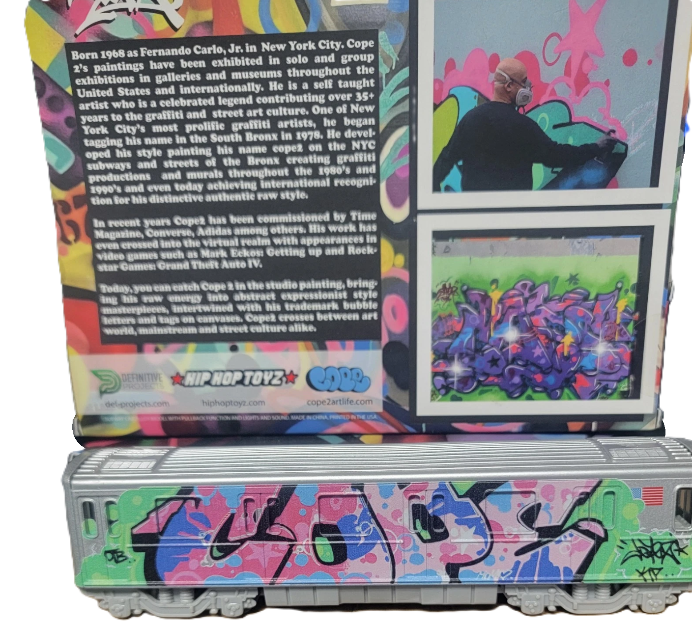 The Beast Train is more than a toy; it is a sculptural homage to graffiti's foundational connection to New York City’s MTA trains. This street pop art and graffiti artwork piece celebrates the movement’s original canvas—rolling steel. Designed by Cope2 and distributed through Hip Hop Toyz, the product comes fully painted with lights and sound, capturing the essence of a live, mobile art installation. Each side of the miniature train features Cope2’s vibrant handstyle, rendered with authentic detail on a metallic base, echoing the same tones and tags that once traveled across NYC in real time.